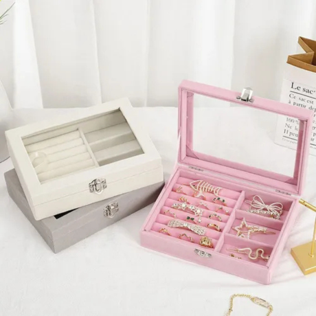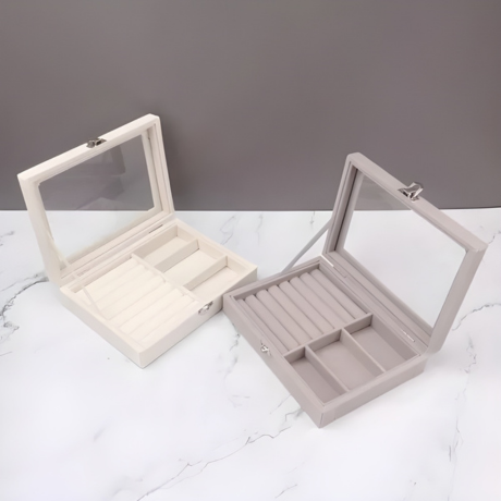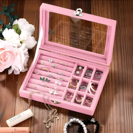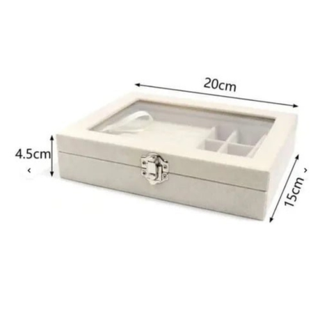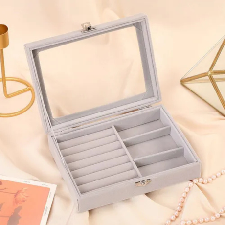 Elegante joyero de tamaño mediano ideal para organizar y proteger tus anillos, aretes, collares y pulseras. Cuenta con compartimientos internos y forro suave que evita rayones. Su diseño moderno y compacto lo hace perfecto para el hogar o para llevar de viaje.