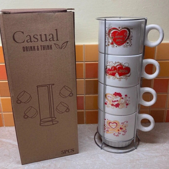 Presentamos nuestro set de 4 pocillos con exhibidor, perfecto para organizar y lucir tu vajilla de manera elegante y práctica.
